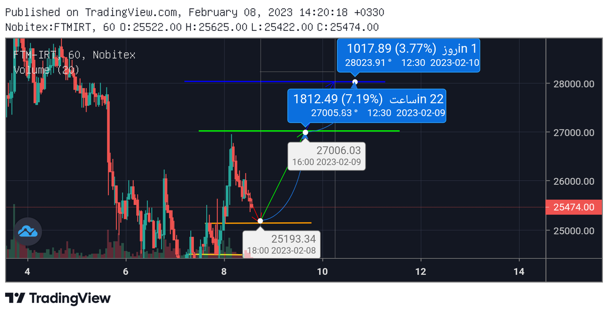 اگر خط مقاومت که 25/400 هست رو رد کرد به خط نارنجی میرسه و بعد حرکت خودش رو شروع میکنه به سمت خط سبز احتمال خیلی کم هست که به خط نارنجی برسه خیلی ها احساس ترس میکنند و ارز رو میفروشند و باعث زیرش به سمت 24/000 تومان هم میره هیچ ترس از ریزش نداشته باشید چون این ارز آینده دار هست