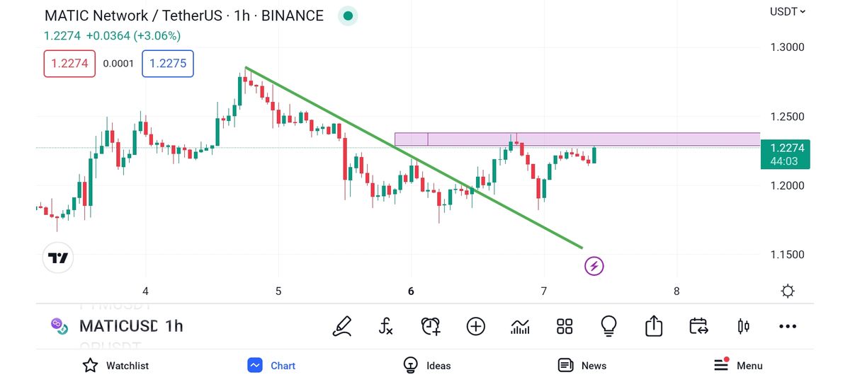 سلام ارز فوق همانطور که مشاهده میشودپس ازآنکه خط روند نزولی خودراشکست توانست سقف وکف جدید ایجاد کند والان درگیرمحدوده رسم شده می باشد درصورتی که قیمت بتواند بالای محدوده رسم شده تثبیت دهدپالیگان میتواندقیمت های بالاتر راببیند
