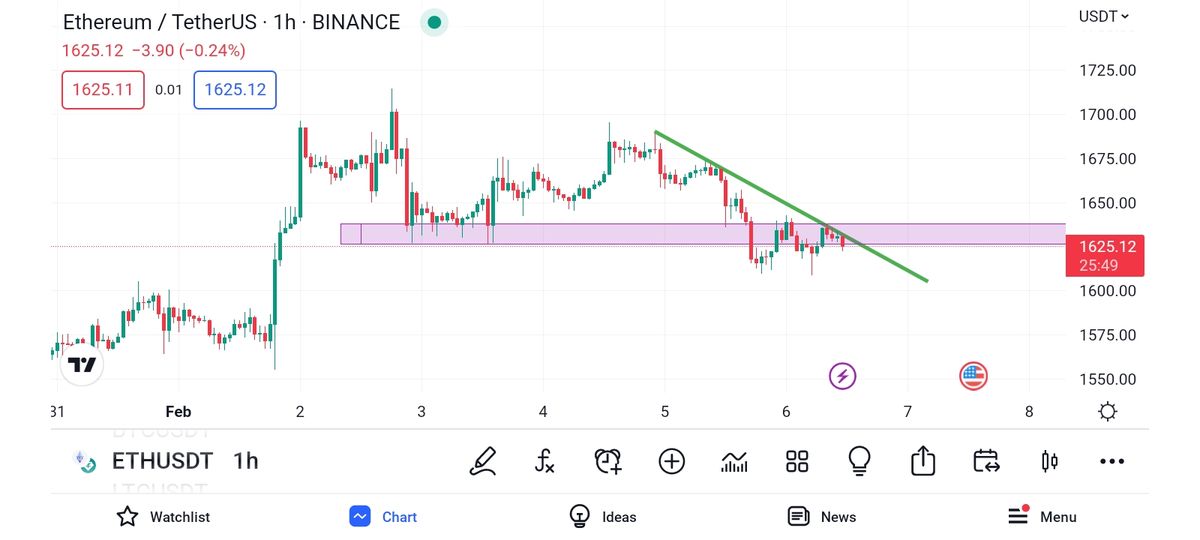 رسم شده است دوسناریو وجوددارد:1. اگر اتریم بتواند محدوده صورتی رسم شده را رو به پایین کلوز دهد وتثبیت کند میتوانیم پوزیشن شورت بگیریم 2.اگربتواندخط روندسبزرنگ رابشکند وازترند نزولی خارج شود باید پوزیشن لانگ بگیریم
