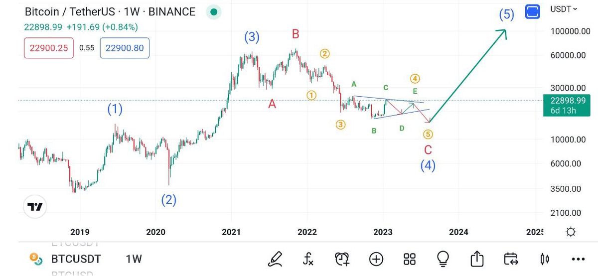 بنظر من همچین چیزی براش میبینم و خیلی ها فکر میکنمد این موج B که کف پایین تر زده شروع بازار بوده ولی بنظر من در اشتباه هستند🤦♂