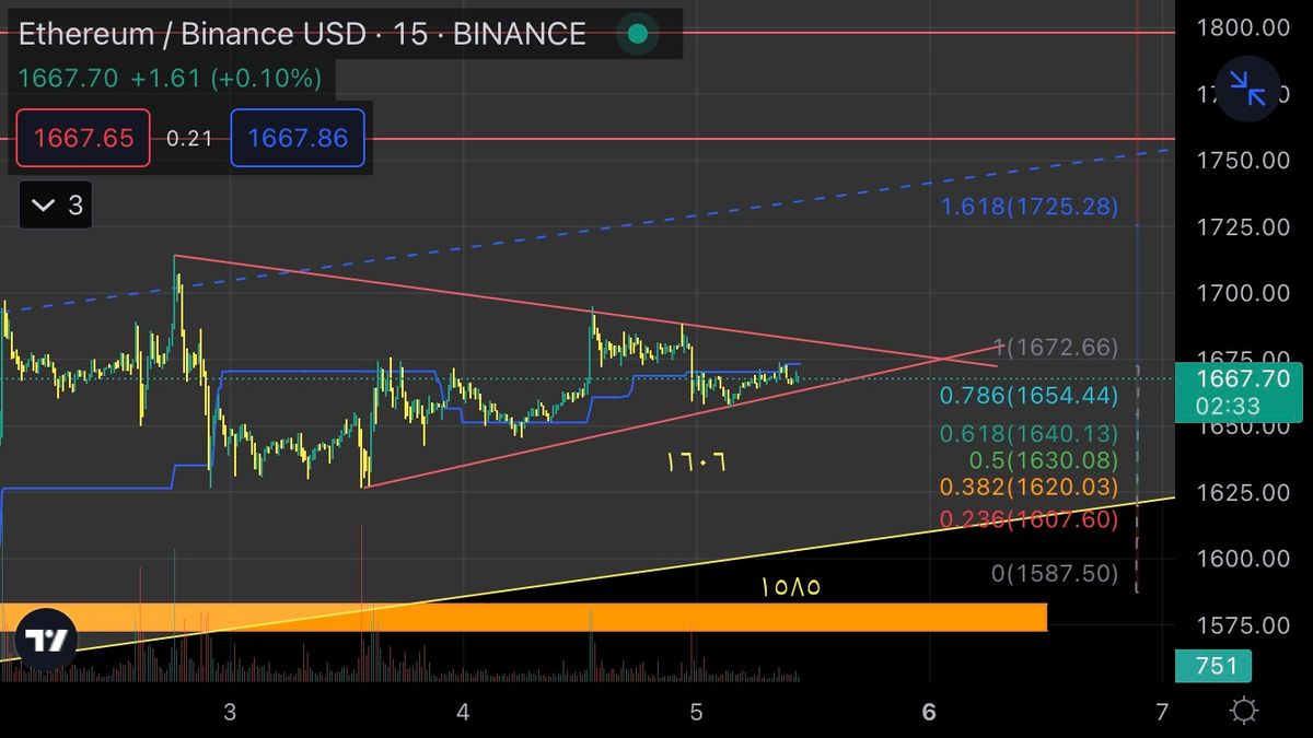 الان اتر توی یه مثلثگیر کرده و چون حجم معاملات پایینه و از میانی کانالم هم پایین تره. من میگم نزول میکنه. ولی از هر طرف این مثلث خارج بشه چه اصلاح چه صعود عدد های بالای رو میبینه. من با حدد ضرر ۱۶۸۵ سل گرفتم. دوستان صاحب نظر دوست دارم که تحلیلشون رو ب اشتراک بزارن ممنونم. توی کف این کانال الان ۱۶۰۶ هست. که من احساس میکنم اگه ۱۶۰۶ رو بشکنهو حمایت نشه۱۵۸۵ هست هدف بعدیش