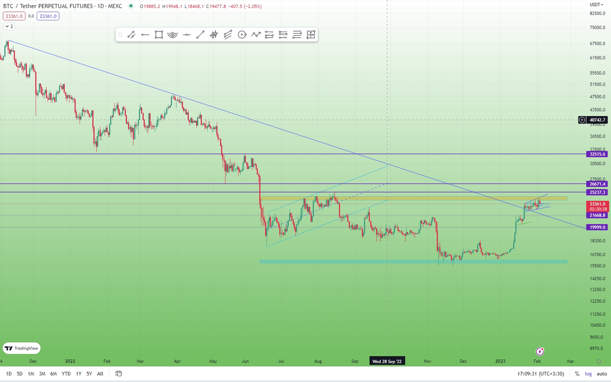 BTC USDT 1 DAY تحلیل : دوستان بیتکوین تایم روزانه مشاهده میکنیم از روند نزولی بلند مدت خارج شدیم و برای ادامه روند صعودی باید سطح زرد رنگ شکسته شود