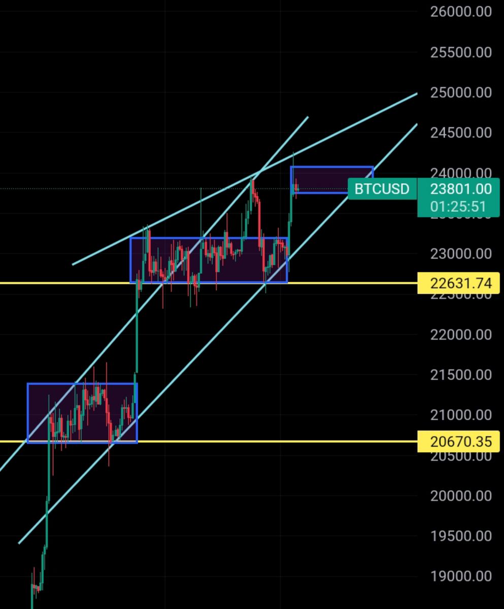 بیتکوین تا حدودا ۴ الی ۵ روز دیگه رنج میزنه بین محدوده(۲۳۶۰۰تا۲۴۲۰۰) تا برسه به کف کانال صعودی و یه پامپ کنه