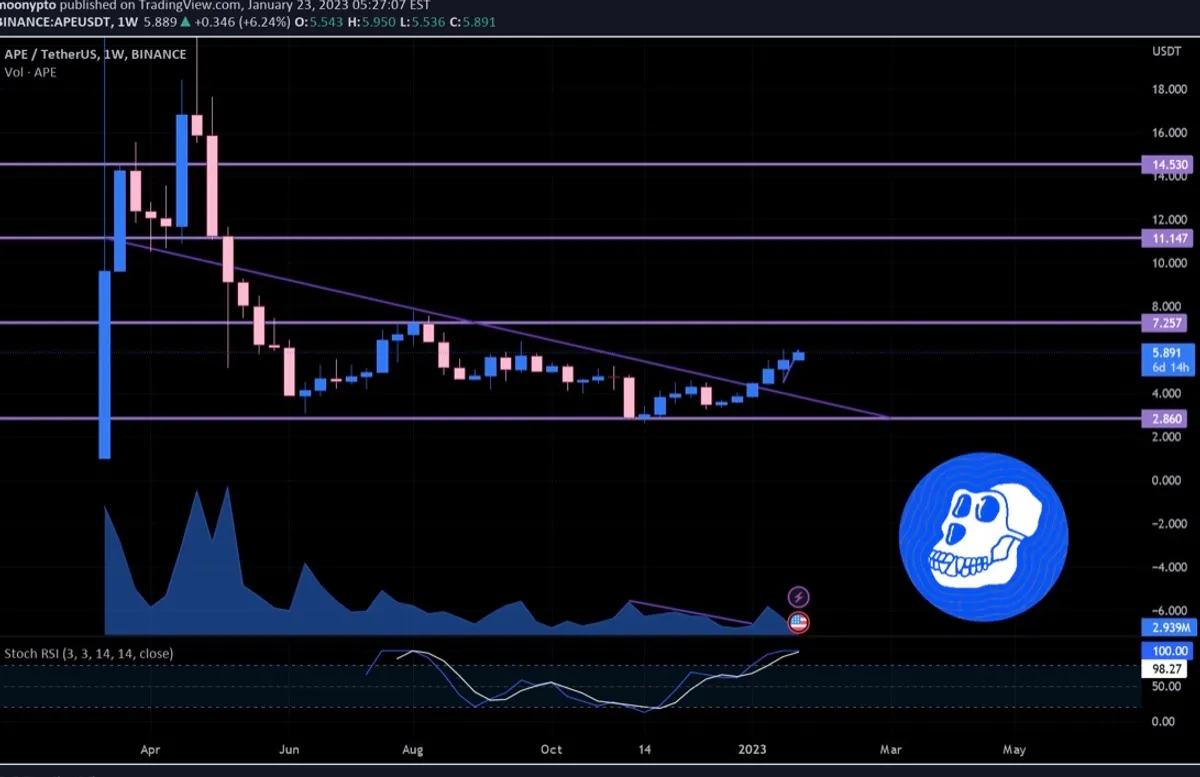 اولین مقاومت اصلی 7-7.2 دلار است و اگر Apes آن را بشکند، 7.5، 7.9 اهداف بعدی هستند. اگر توانستید آن را با قیمت 3.5 بخرید، کمی هم سود ببرید