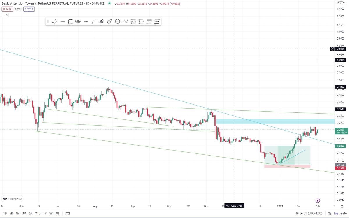 سلام ارز دیجیتال BAT رو مشاهده میکنید در تایم روزانه که از نزولی خارج شده انتظار میره بعد از شکست محدوده ای ابی رنگ تارگت های روی چارت تاچ شود
