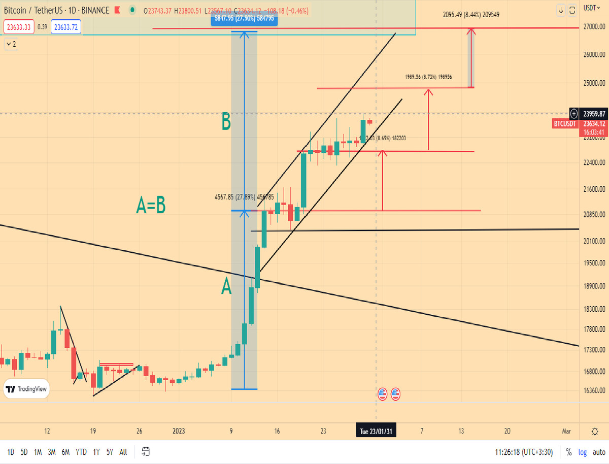 سلام و درود به هموطنان گرامی.چارت بیت در تایم روزانه رو در تصویر پیوست مشاهده میکنید.قیمت این ارز طی یک موج ایمپالس صعودی از 16400 دلار شروع به صعود تا محدوده 21000 دلار کرده و در ادامه با تثبیت قیمت و همچنین تولید فلگ در تایم های پایین تر موفق به شکست ناحیه ی مذکور شده است.با توجه به مومنتوم و زاویه ی قابل قبول صعودی و همچنین تثبیت قیمت طی محدوده 21000 دلار میتوان انتظار یک حرکت اندازه گیری شده نسبت به شروع از کف این موج صعودی(16400) تا 21000 دلار(محدوده A در تصویر) را در ادمه و البته ضمن نوسان متصور بود (ناحیه ی B ).ما به وضوح در حال صعود طی کانال صعودی بوده ایم و بعد از تثبیت قیمت حرکت جدید صعودی از 21000 به 22700 شکل گرفت و به مدت 8 روز در این ناحیه انباشت و تثبیت قیمت صورت گرفت و دیروز نیز شاهد شکست این ناحیه ی رنج در تایم 4 ساعته و کندل تاییده این شکست بودیم.با توجه به موارد مذکور نواحی 24900 دلار برای هدف بعدی قیمت (ضمن نوسان تا محدوده ی 22600) و در صورت تثبیت و تولید فلگ در تایم های ساعتی در این محدوده قیمتی.. هدف بعدی 26900 دلار به صورت کوتاه مدت در دسترس خواهد بود.