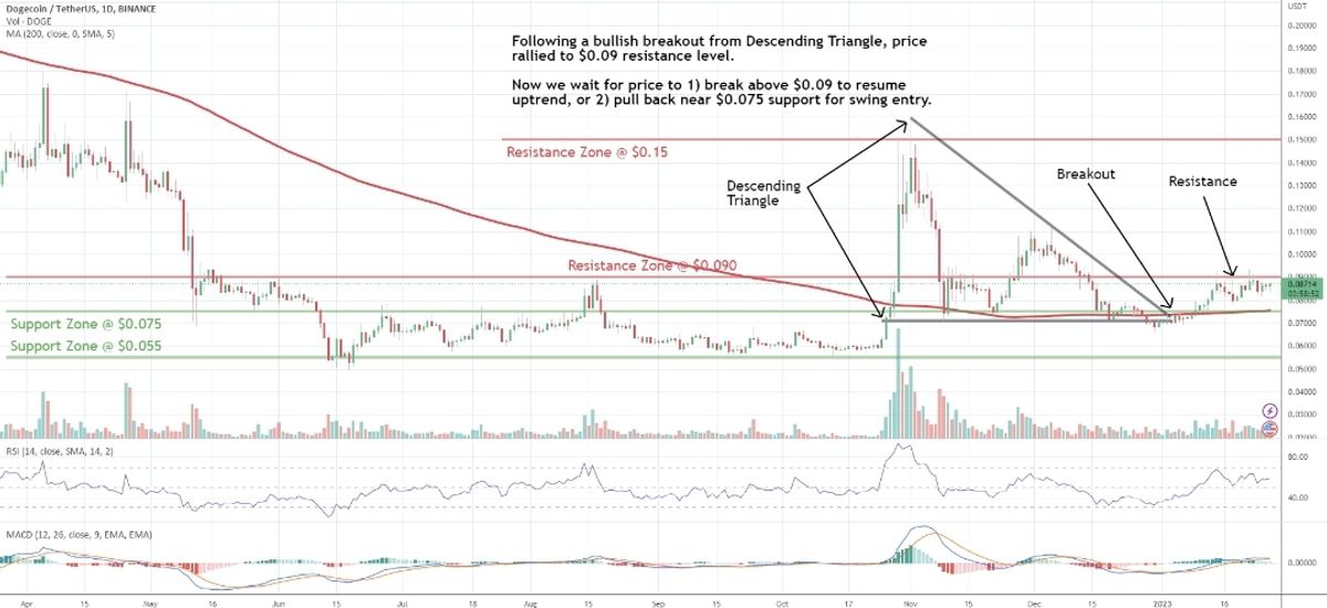 باشکستن مثلث نزولی درادامه قیمت تا سطح مقاومتی 0.09 پیش رفت که الان باید منتظر باشیم