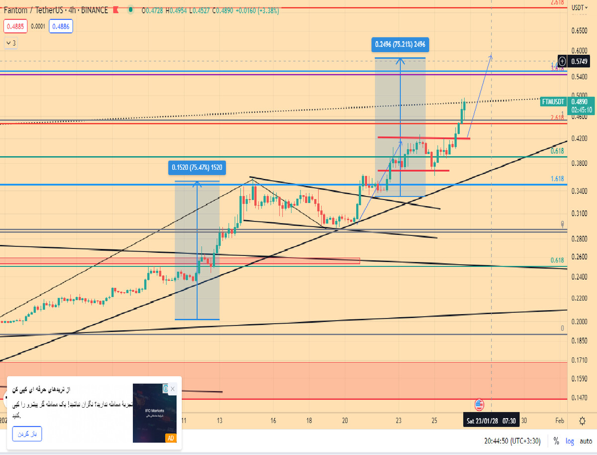 سلام و وقت بخیر .امروز شاهد صف ارایی کندل های رالی صعودی در تایم 4 ساعته فانتوم هستیم که با توجه به کلوز در انتهای کندل ها نشان از خریدارانی مصمم برای هدف های بالاتر قیمتی است. قیمت 0.49 مید لاین کانال صعودی تایم روزانه ما هست ..با استفاده از محاسبه یک حرکت اندازه گیری شده از 0.19 و در ادامه تولید کارکشن و تثبیت قیمت در کانال 0.30 و پس از شکست سقف این پرچم و همچنین الگو قرار دادن یک حرکت هم شکل در تایم 4 ساعته متوجه نشان گرفتن هدف قیمتی 0.585 تا 0.6 خواهیم شد.در ادامه با رسم یک فیبوناچی گسترش یافته ابتدا در تایم روزانه و بعد در نمودار 4 ساعته به ترازهایی میرسیم که با هم در محدوده قمیتی مشابهی قرار دارد(PRZ).این ترازها در قیمتهای 0.45 و 0.545 قرار دارند.همچنین وجود یک خط روند با شیب ملایم در نمودار 4 ساعته سد قابل اعتمادی برای اصلاحات و حمایت قیمتی خواهد بود.جمع بندی و نتیجه گیری با استفاده از موارد مذکور :: با توجه به مونتوم قابل قبول صعودی و همچنین هدفهای الگوهای پرایس اکشن در تایم 4 ساعته و روزانه(0.585 تا 0.6) و شکست ناحیه ی اول PRZ فیبو اکستنشن در ناحیه ی 0.45 (با قدرت) میتوان به تحقق اهداف این الگوها (0.585)وزن بیشتری داد که در این صورت و با رسیدن و تثبیت قیمت در ناحیه ی 0.585 متوجه شکست ترازهای فیبوناچی اکستنشن (نواحی PRZ)و قرار گرفتن قیمت بالای مید لاین کانال صعودی تایم روزانه و تبدیل همه اینها به سدی قدرتمند در برابر اصلاحات.میتوان به ادامه حرکت صعودی تا محدوده 0.85 تا1 دلار احتمال بیشتری داد .به زبانی دیگر ذات قیمت تنبل است و پس از شکست و تثبیت در 0.6 حمایت های سنگینی زیر پای خود مشاهده میکند و حال جدال و جنگ با انها را ندارد و ترجیح میدهد راه راحت تر (حرکت صعودی به 0.85 و بعد 1 دلار ) را پیش بگیرد زیرا مقاوت ها کمتر از حمایت ها میباشد...... ......الایحال نقاط بهینه حمایت در 0.45 و 0.36 به صورت قدرتمند قرار دارند و مهمترین مقاومت پیش رو در تایم 4 ساعته 0.55 تا 0.6 خواهد بود.(خودم چون در نقطه خوبی (0.22 )ورود کردم فعلا خارج نمیشم ). امیدوارم مفید فایده باشه و دوستان رو در جهت مدیریت معاملات راهنمایی کنه یا نکاتی رو متذکر بشه و با مدیریت سرمایه تریدر بمانید.
