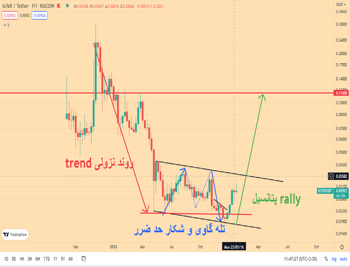 بسم الله الرحمن الرحیم.با سلام و احترام نمودار IOTX /USDT در تایم هفتگی رو مشاهده میکنید که با توجه به ساختار و همچنین تکنیکال پتانسیل صعودی دارد.از نظر تئوری ساختاری TREND/TRAP/RUN ما در یک روند نزولی قرار داشتیم که تلاش گاوها برای بالا بردن قیمت شکست خورده و خرسهای جسور موفق به تست دوباره کف و شکار حد ضرر گاوها شدند و در سال جدید میلادی و با توجه به نمودار صعودی بیت کوین گاوها تلاش دوباره ای رو برای شروع روند صعودی اغاز کردند و با توجه به 3 کندل صعودی پرقدرت که بر روی انتهای کندل کلوز کرده و فاقد سایه و پین بار از بالا میباشد نشان از مصمم بودن گاوها برای بالا بردن قیمت میباشد.از طرفی وجود سه کندل صعودی قوی در انتهای یک روند نزولی ضعیف شده خود یک الگوی صعودی (3 سربازسفید) نیز به شمار میرود که به عنوان تاییده ورود به معامله خرید به ما کمک میکند.از نظر میانگین قیمتی ما در تایم روزانه بالای میانگین 100 و 200 قرار داریم و در حال تثبیت قیمت و تولید پرچم هستیم.با توجه به فاکتورهای مذکور پیشنهاد معامله خرید از محدوده 0.029 تا 0.022 به صورت پلکان و البته با مدیریت سرمایه و با قرار دادن حد ضرر 0.02 و با هدف اول 0.0585 به صورت کوتاه مدت و هدف دوم 0.10 میان مدت به دوستان نوسان گیر دارم..................اعتبار این تحلیل تا زمانی است که مارکت خالی از هرگونه شوک(چه در زنجیره کریپتو و چه در مقیاس اقتصاد کلان جهانی و عوامل ژئوپلیتیک) به رفتار طبیعی خود ادامه دهد و بروز عوامل مذکور میتواند ناقص این تحلیل باشد و اینجا است که ضرورت مدیریت سرمایه و بهره بردن از پلن معاملاتی خود را به رخ میکشد و عالم مطلق ذات مقدس خداست.