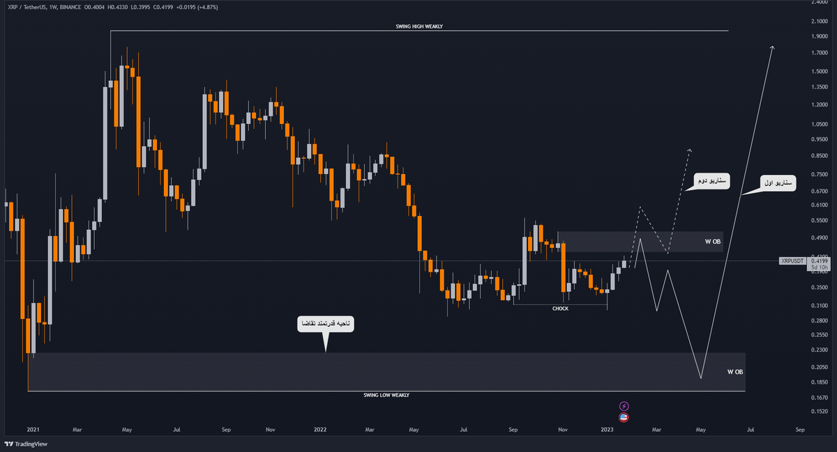قیمت این ارز در یک رنج بسیار بزرگ هفتگی چندین ماه است گرفتار شده،در ژوئن میلادی سال قبل قیمت با نفوذ به کانال 0.2 دلار توانسته یک حمایت نسبی تشکیل بدهد و سعی از جلوگیری ریزش بیشتر بکند،به نسب بازار خرسی بسیاری از رمز ارز ها ریپل هم جز معدود آلت کوین هایی بود که سویینگ هفتگی خودش را در بازار خرسی روی حالت صعودی نگه داشته و این برای شخص بنده بسیار ارزشمند است،در صورت اصلاح دوباره و ورود به ناحیه 0.22 تا 0.18 اعداد بسیار مناسبی برای خرید برای تارگت سقف تاریخی هستند،ولی اگر از همینجا بتواند اعداد 0.51 دلار را با بستن کندل رد کند،محدوده 0.30 تا 0.40 احتمالا بهترین ناحیه برای خرید های بعدی می باشند،این تحلیل به روز رسانی خواهد شد.موفق و پر سود باشید.