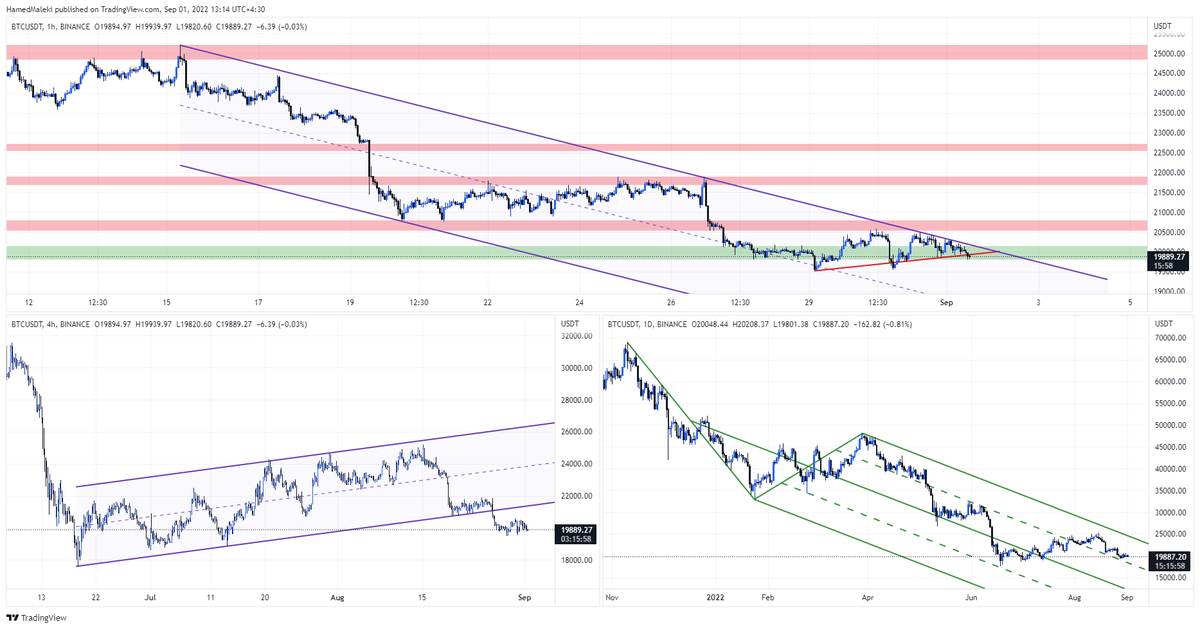 گراف 1H : بالا که بیت کوین در یک کانال نزولی در حال حرکت هست و اگر ترند صعودی قرمز کوچک رو (که یه بار به صورت فیک شکسته) بتونه بشکنه، اصلاح تا 18000 محتمل خواهد بود.