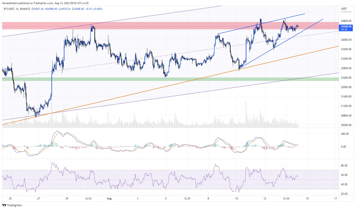 در ادامه تحلیل دیروز (نمودار 4 ساعته) ، برای امروز و با بررسی نمودار 1 ساعته،میتوان الگوی کنج نزولی رو مشاهده کرد که همراه با واگرایی منفی جزئی هست. ولی چون قیمت در محدوده مقاومت 24500 در حال نوسان هست و ریزشی نداشته، همچنین از طرفی فردا دوشنبه اغاز هفته هست، احتمال اینکه الگوی کنج نزولی عمل نکنه و قیمت مقاومت رو به سمت بالا بشکنه بسیار بیشتر خواهد بود.