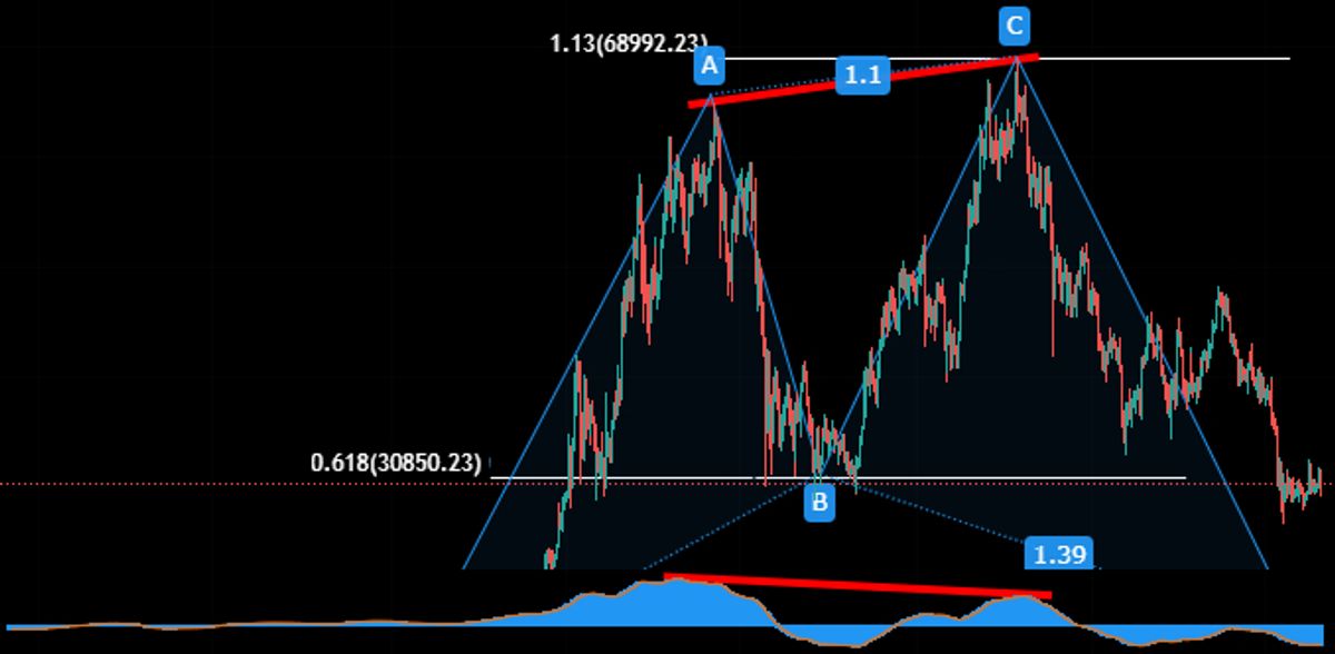 الگوی هارمونیک شارک یکی از پر کاربردترین الگو هاست و بیشتر زمانی اتفاق می افته که بزرگای اون بازار نمی تونن تسویه معاملات باز رو انجام بدن بعد با یک افزایش قیمت تغییر پوزیشین می دن و معاملاتشون رو می بندن که یکی از نشانه های این الگو واگرایی در مکدی و اتفاق میفته در دو قله A C AB=CD می تواندتا فیبو ناچی 1.13 xa اصلاح کند که نظر من اینه از ناحیه 0.886 xaبرگشت قیمت خواهیم داشت این اتفاق زمانی رخ می دهد که ماینر ها در صورت مشاهده قیمت به زیر 20000 به فروشنده اضافه خواهند شد