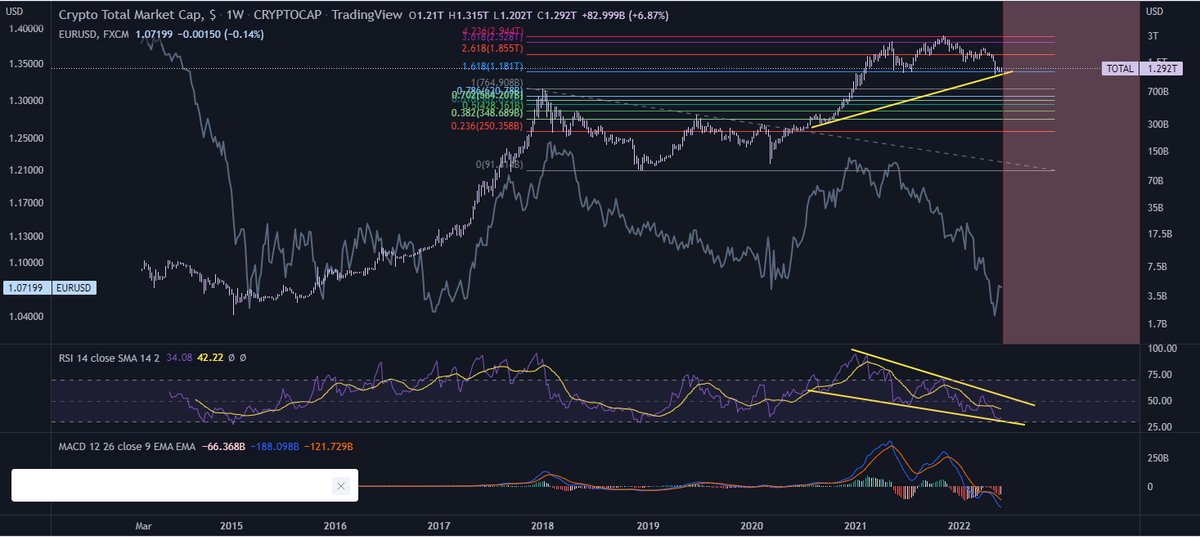 EUR به شدت با TOTAL همبستگی دارم و به نظر می رسد EUR به کف رسیده. RSI هفتگی TOTAL به پایین ترین حد خودش نزدیک شده، واگرایی صعودی پنهان و یک کنج در حال سقوط در RSI هفتگی و TOTAL وجود داره.
