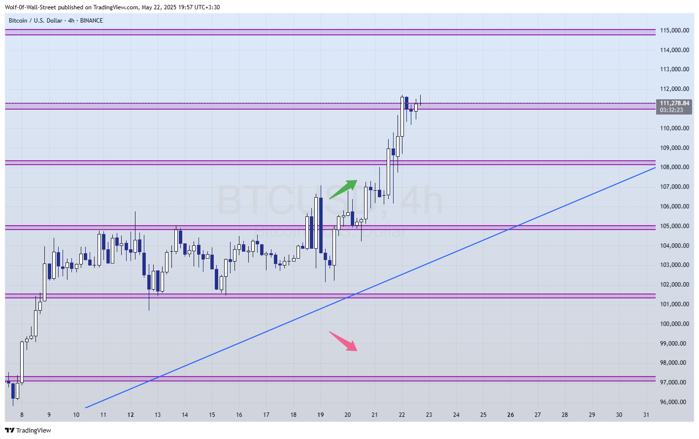 در ادامه و در صورت رشد بیشتر قیمت باید منتظر واکنش قیمت به محدوده 115000 دلار بمانیم