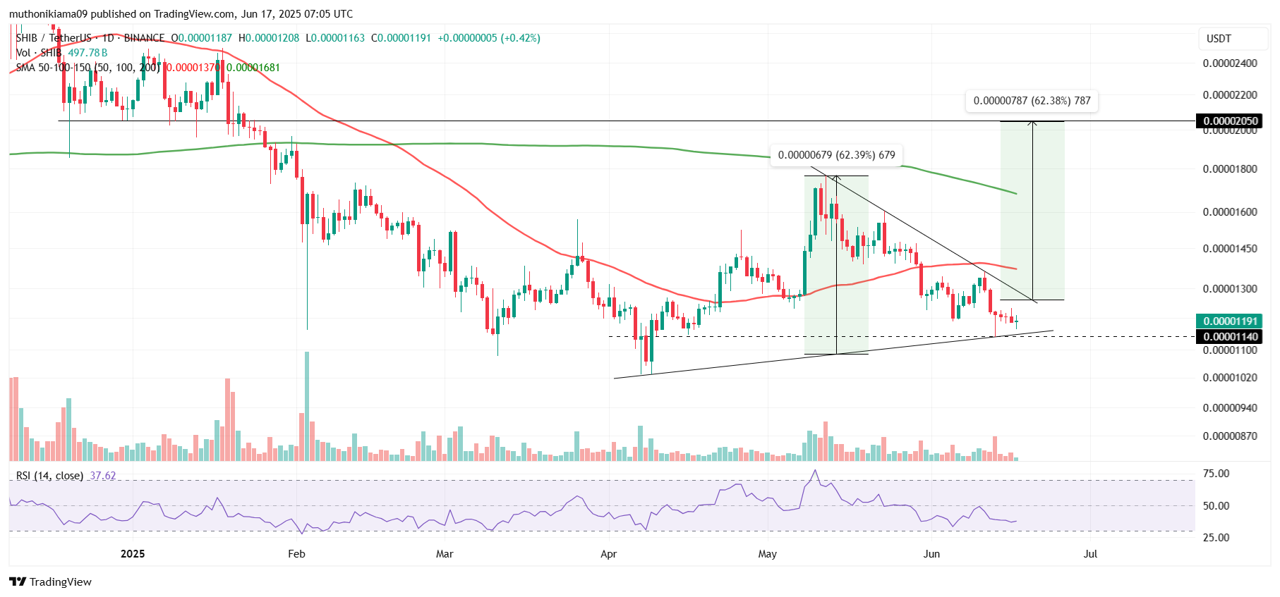- قیمت شیبا اینو در آستانه یه رالی ۶۲ درصدیه، اگه بتونه از الگوی مثلث متقارن صعودی خارج بشه.