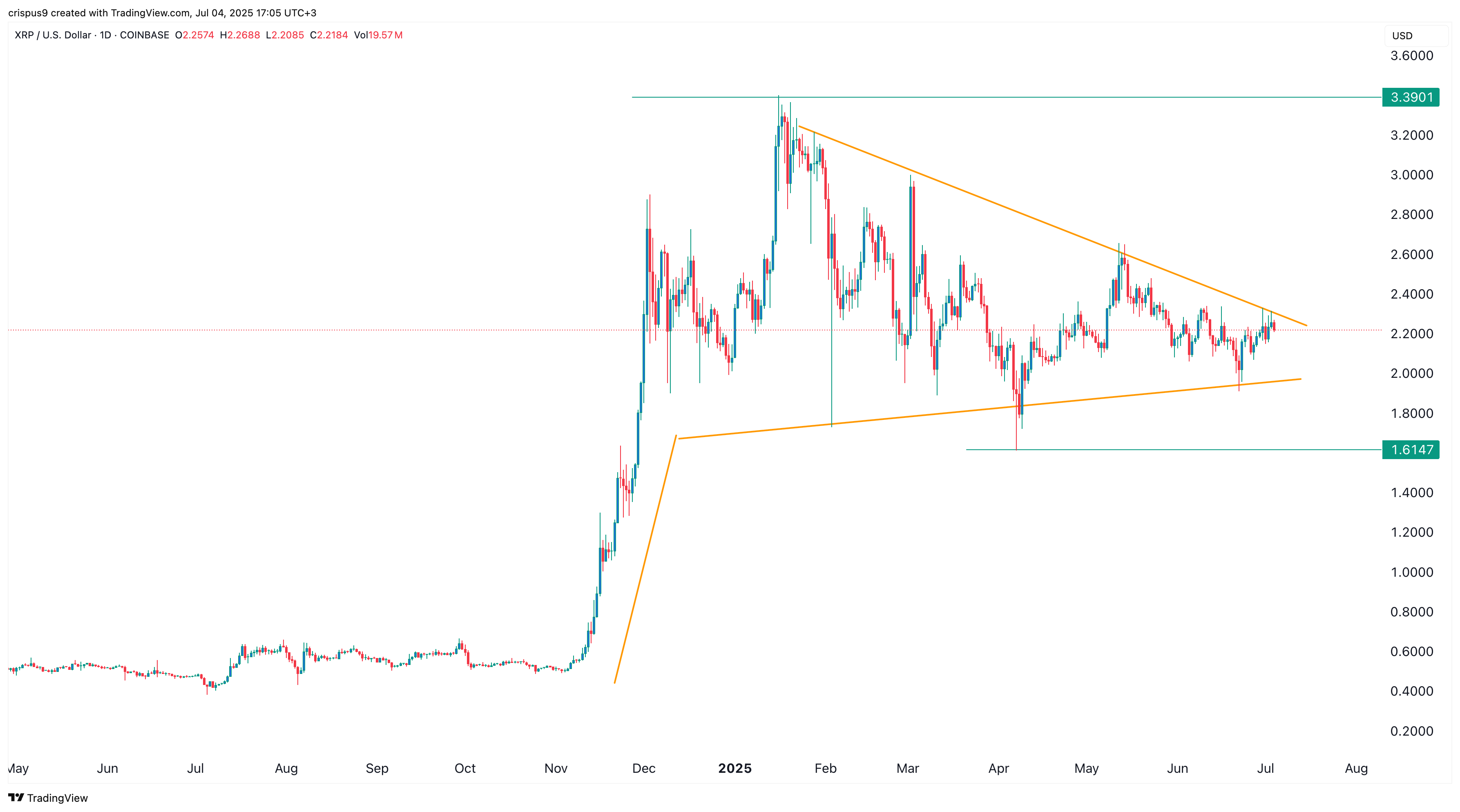 تثبیت فعلی قیمت XRP میتونه آرامش قبل از طوفان باشه و به یه جهش قیمتی منجر بشه که ممکنه به زودی اتفاق بیفته. این ارز تو چند ماه گذشته یه الگوی “مثلث متقارن” تشکیل داده و فاصله بین دو خط این مثلث داره کم میشه.