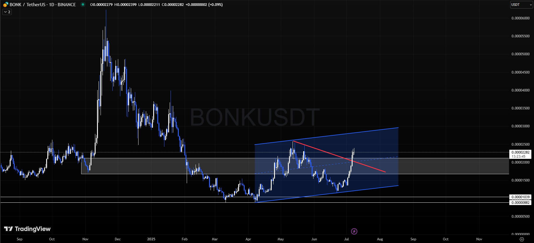 چارت روزانه BONK/USDT نشون میده که این میمکوین معروف داره توی یه کانال صعودی منظم حرکت میکنه. با اینکه یه خط روند نزولی طولانیمدت جلوی راهش بوده، اما الان قیمت موفق شده از این خط قرمز رد بشه و وارد یک منطقه مقاومتی مهم شده. اگه BONK بتونه این منطقه رو رد کنه و داخل کانال بمونه، میتونه برای یه رشد قابل توجه دیگه آماده بشه.