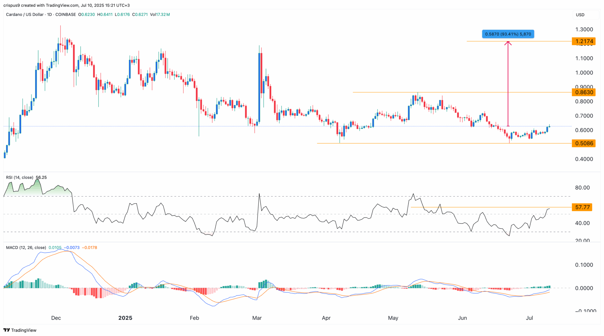 قیمت ADA به ۰.۶۳۲۰ دلار رسید، که بالاترین سطح از ۱۶ ژوئن (۲۶ خرداد) و ۲۵% بالاتر از پایینترین سطحش تو این ماه هست. دادههای CoinMarketCap نشون میده که این رالی تو یه محیط با حجم بالا اتفاق افتاده، جوری که حجم روزانه ۸۷% افزایش پیدا کرده و به ۱.۱ میلیارد دلار رسیده.