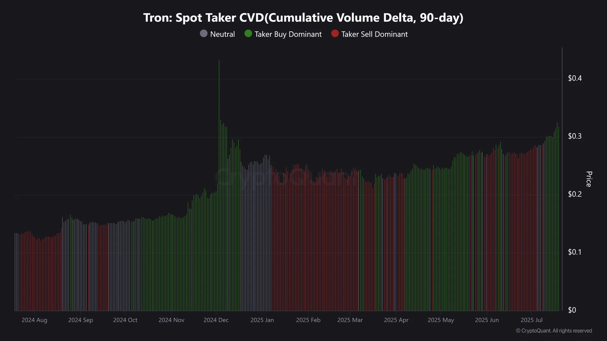 در حال حاضر، این شاخص نشان میدهد که حجم خرید (Taker Buy Volume) غالب است. این وضعیت اغلب با حرکات صعودی قیمت همبستگی دارد. این روند با افزایش فعالیت در شبکه ترون همسو است که احتمالاً ناشی از محبوبیت تراکنشهای استیبل کوین و راهاندازی اولین شرکت خزانهداری TRX است.