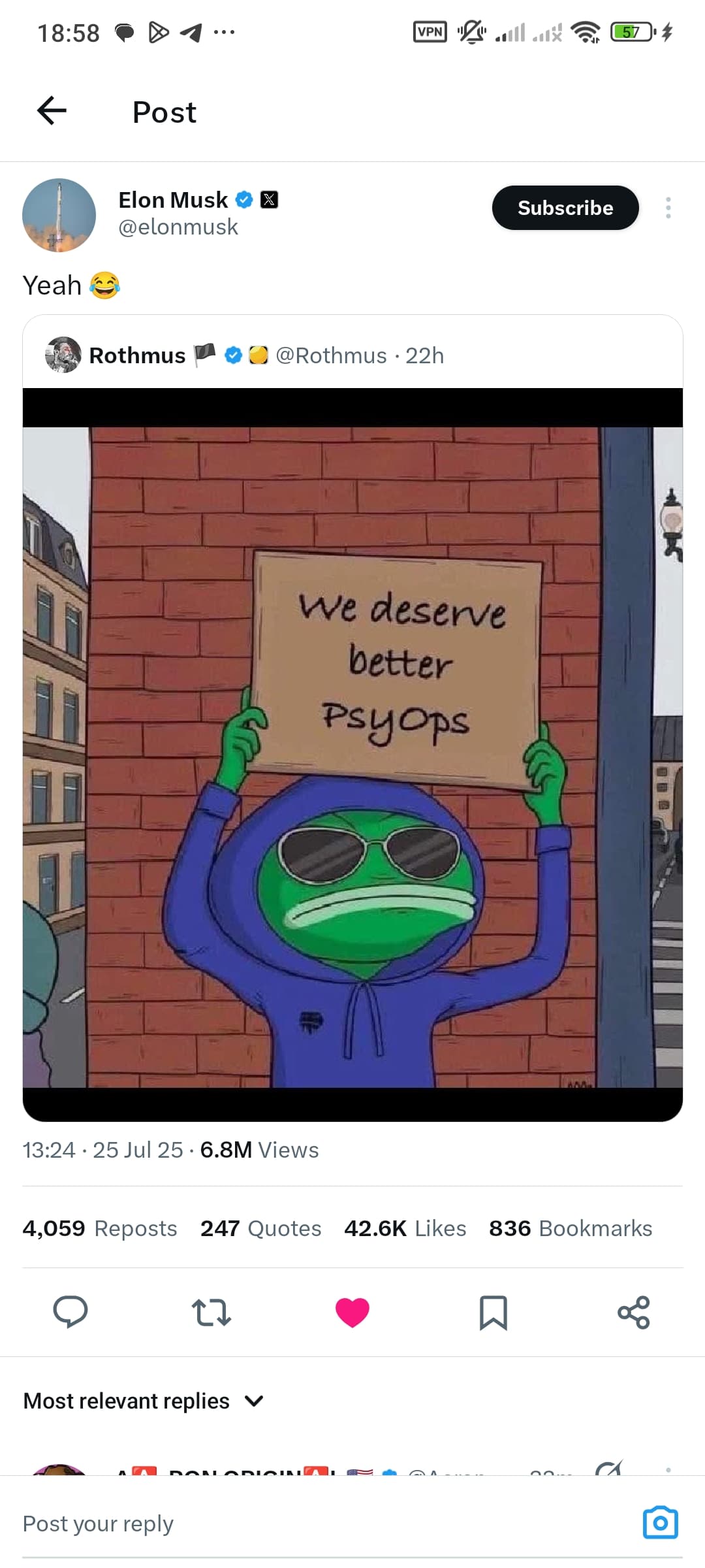 یکی با نام کاربری @ROTHMUS یه تصویر از پپه pepe-coin-pepe گذاشته، در حالی که قورباغه پپه با یه ظاهر شیک و عینک آفتابی ایستاده یه برگه دستش گرفته که ما شایستگی توجهی / روانی بیشتر از این رو داریم ایلان ماسک @@elonmusk هم یه خنده فرستاده بله