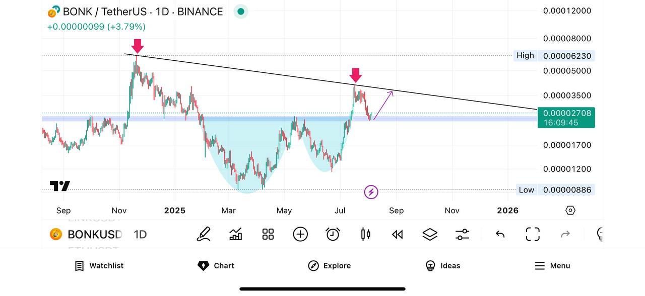 به نظر میرسه BONK اماده حرکت به سمت خط روند نزولی و تست مجدد است درمحدوده برخورد تقریبی 0.000037
