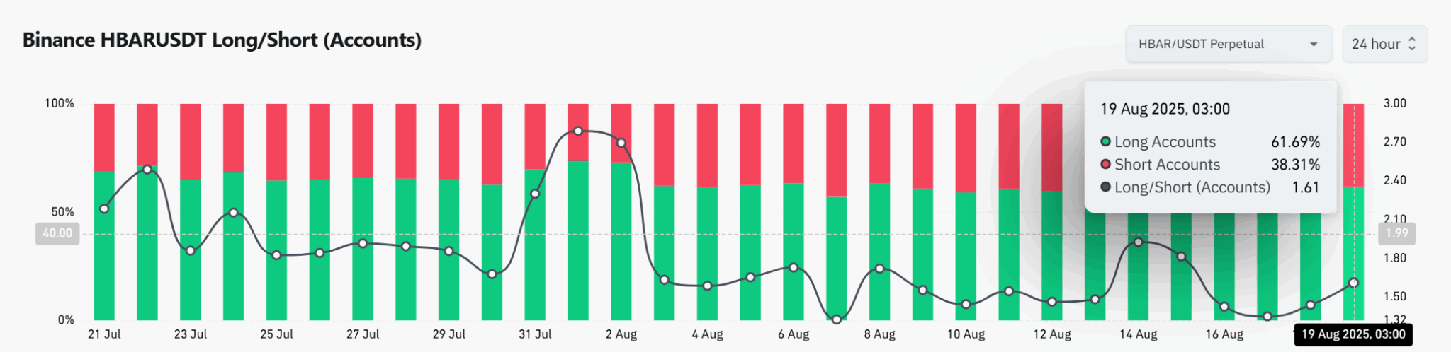 بر اساس تحلیلهای CoinGlass، موقعیتهای معاملاتی آتی نیز این جو را منعکس میکنند؛ حسابهای لانگ (خرید) در بایننس ۶۱.۶۹٪ را در مقابل ۳۸.۳۱٪ شورت (فروش) به خود اختصاص دادهاند که به نسبت لانگ/شورت ۱.۶۱ ترجمه میشود. ترکیب این هیاهوی ETF و موقعیتهای مشتقه نشان میدهد که عوامل خارجی چگونه چشمانداز قیمت HBAR را به شدت به سمت مثبت سوق میدهند.
