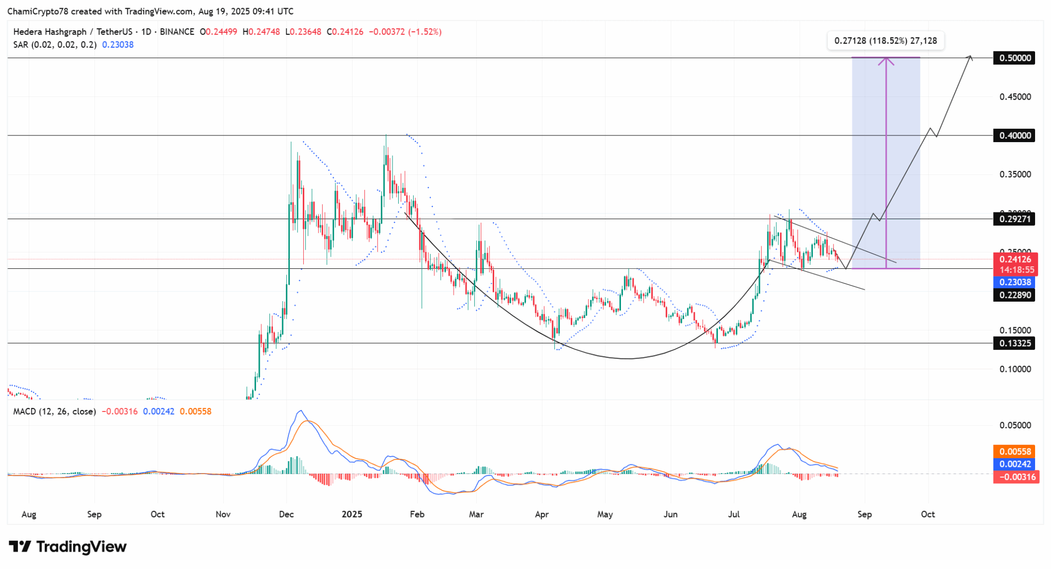 در نمودار روزانه، قیمت HBAR یک الگوی فنجان و دسته (cup-and-handle) تشکیل داده است که نشاندهنده احتمال ادامه حرکت صعودی قیمت است. این توکن اخیراً حمایت در حدود ۰.۲۲۸۹ دلار را آزمایش کرده و به صورت مثبتی بالای این سطح مهم باقی مانده است.