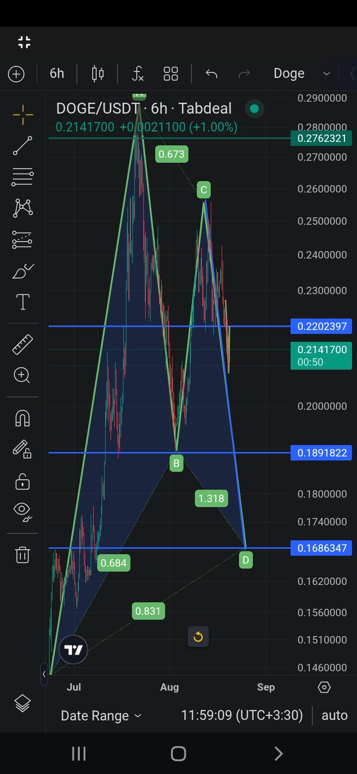 دوج کوین فقط توان رسیدن به عدد ۰.۲۲ رو داره و در واقع داره به شانه ی راست الگوی سر و شانه ی کف معکوس پولبک میزنه از عدد ۰.۲۲ تا ۰.۱۶۸۵ که لگ دوم الگوی گارتلی صعودی قرار می گیره ریزش ۳۱ درصدی رو شاهد خواهیم بود