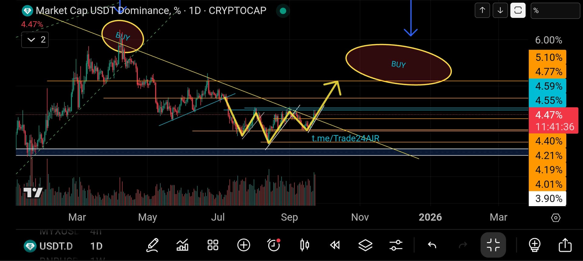 حال روند حرکتی دامیننس تتر را بصورت اجمالی از جولای ۲۰۲۵ در تایم فریم روزانه نگاه کنیم. پترن سر و شانه معکوس مشهوده. که با بستن کندل روزانه بالای ناحیه مقاومتی ۴.۵۵ الی ۴.۵۹ درصد تایید پترن را گرفته و ریزش شدید بازار را شاهد خواهیم بود.