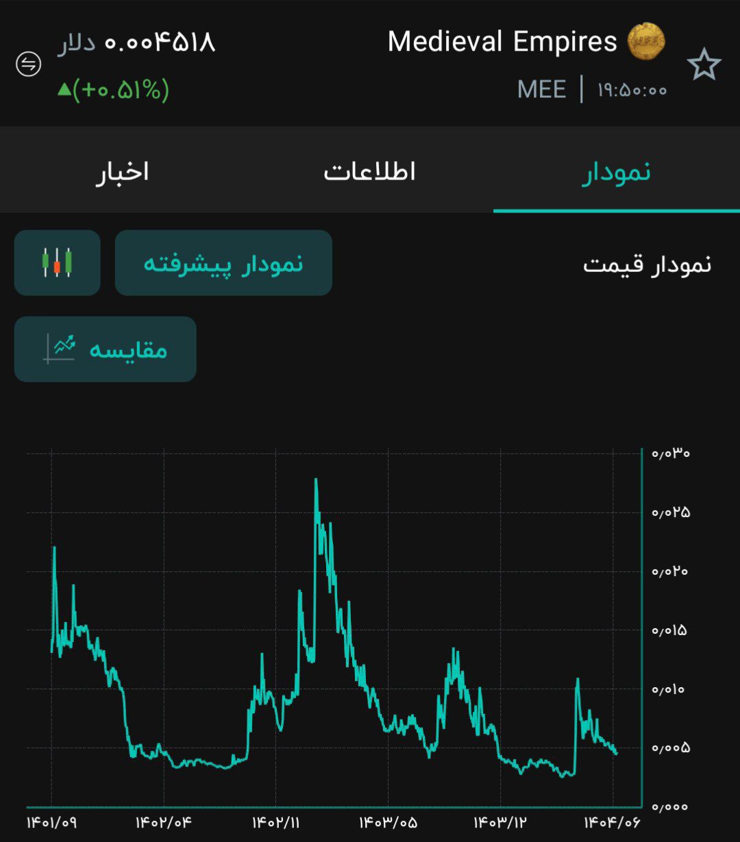ارز Medieval Empires چارت رو دقت کنین زیاد بالا و پایین داشته و طی ۵ الی ۶ ماه راحت تا ۴سنت هم میره