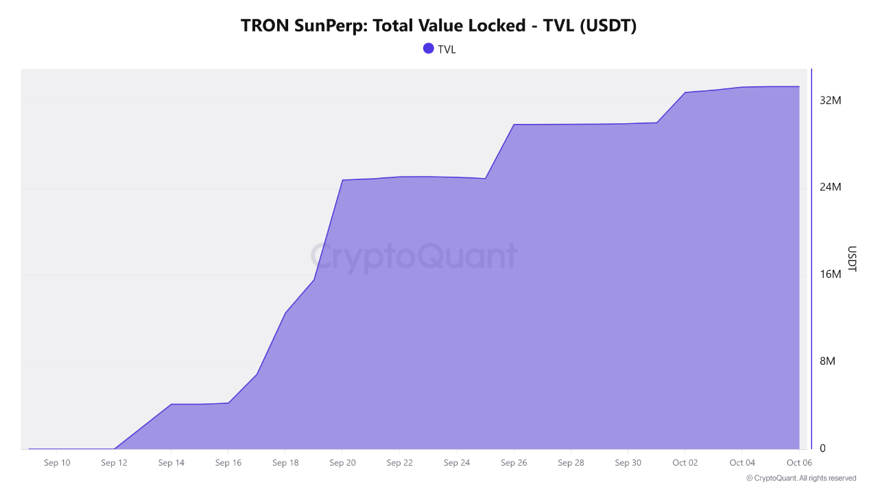 نمودار «ارزش کل قفل شده SunPerp در ترون – TVL (USDT)» یک روند صعودی قدرتمند در نقدینگی قفل شده در پروتکل SunPerp روی شبکه ترون (TRON) رو از اواسط سپتامبر (شهریور) تا اوایل اکتبر (مهر) نشون میده. این روند، بیانگر ورود فازبندی شده سرمایه جدید و تثبیت اون در پروتکل هست که از نقدینگی عمیقتر پشتیبانی میکنه و رقابتپذیری پلتفرم رو در بازار مشتقات غیرمتمرکز ترون افزایش میده.