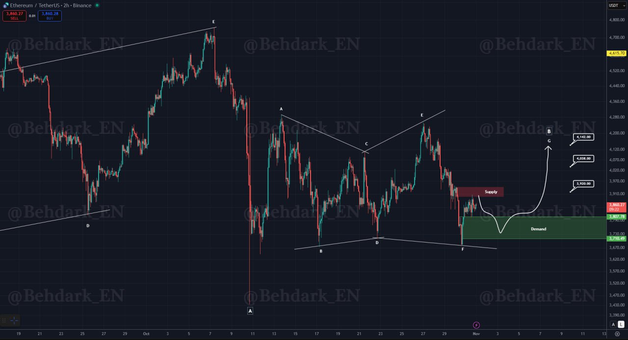 در تایمفریمهای پایینتر، پس از ریزش عمده که موج A را شکل داد، به نظر میرسد موج B به صورت یک الگوی دایامتریک توسعه یافته است، با یک پای باقیمانده به نام موج g. موج g صعودی است و میتواند به سطوح مشخص شده روی نمودار هدفگذاری کند.