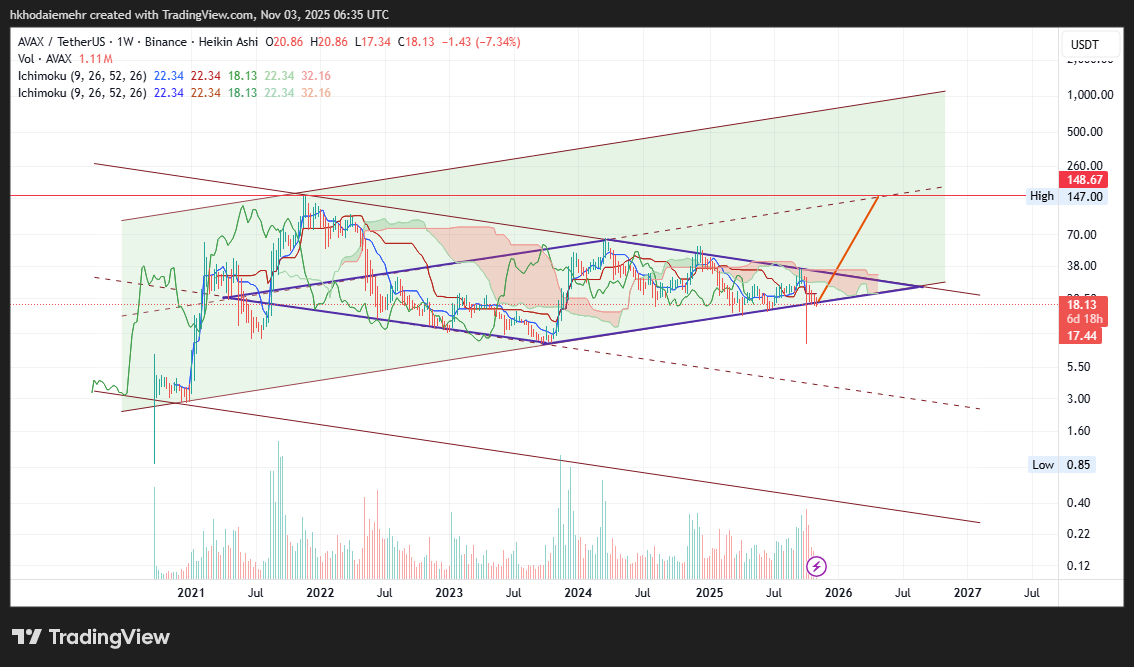 در نموار بلند مدت avaxusdt یک الگوی الماس صعودی شکل گرفته که یک الگوی تغییر روند بسیار قوی هست. در صورتی که سطح مقاومت 33 دلار شکسته بشه تارگت نهایی طبق این الگو محدوده 150 دلار هست.