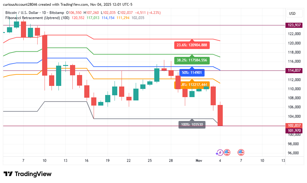 در تایمفریم روزانه بیتکوین، ناحیه 112 الی 114 هزار دلار که منطبق با سطح 50% فیبوناچی اصلاحی بود، به عنوان مقاومت کلیدی عمل کرده و قیمت نتوانست از آن عبور کند. در ادامه بازار با ضعف تقاضا و تشکیل کندلهای خنثی پیدرپی، نهایتاً با یک کندل نزولی قوی از محدوده حمایتی 105 هزار دلار نیز عبور کرد.