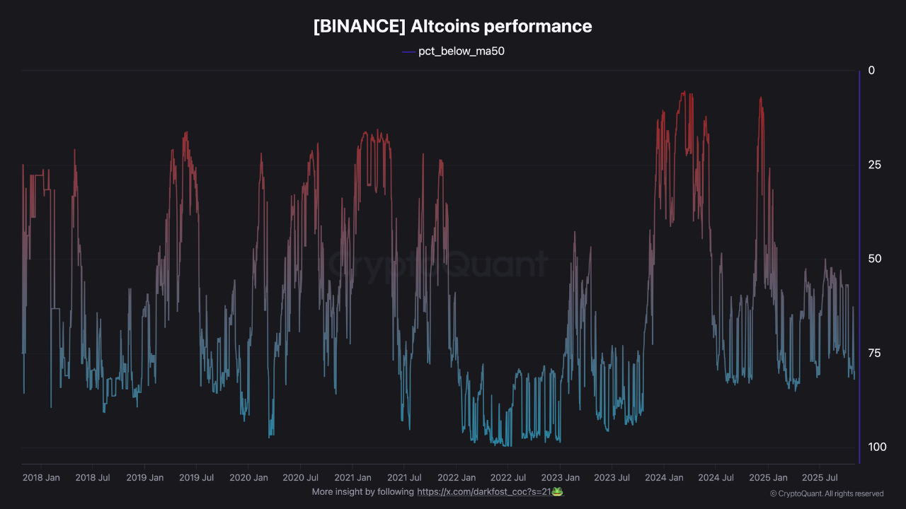 امروز، حدود ۸۲٪ از آلتکوینهای لیست شده در بایننس زیر میانگین متحرک ۵۰ هفتهای خود معامله میشوند.