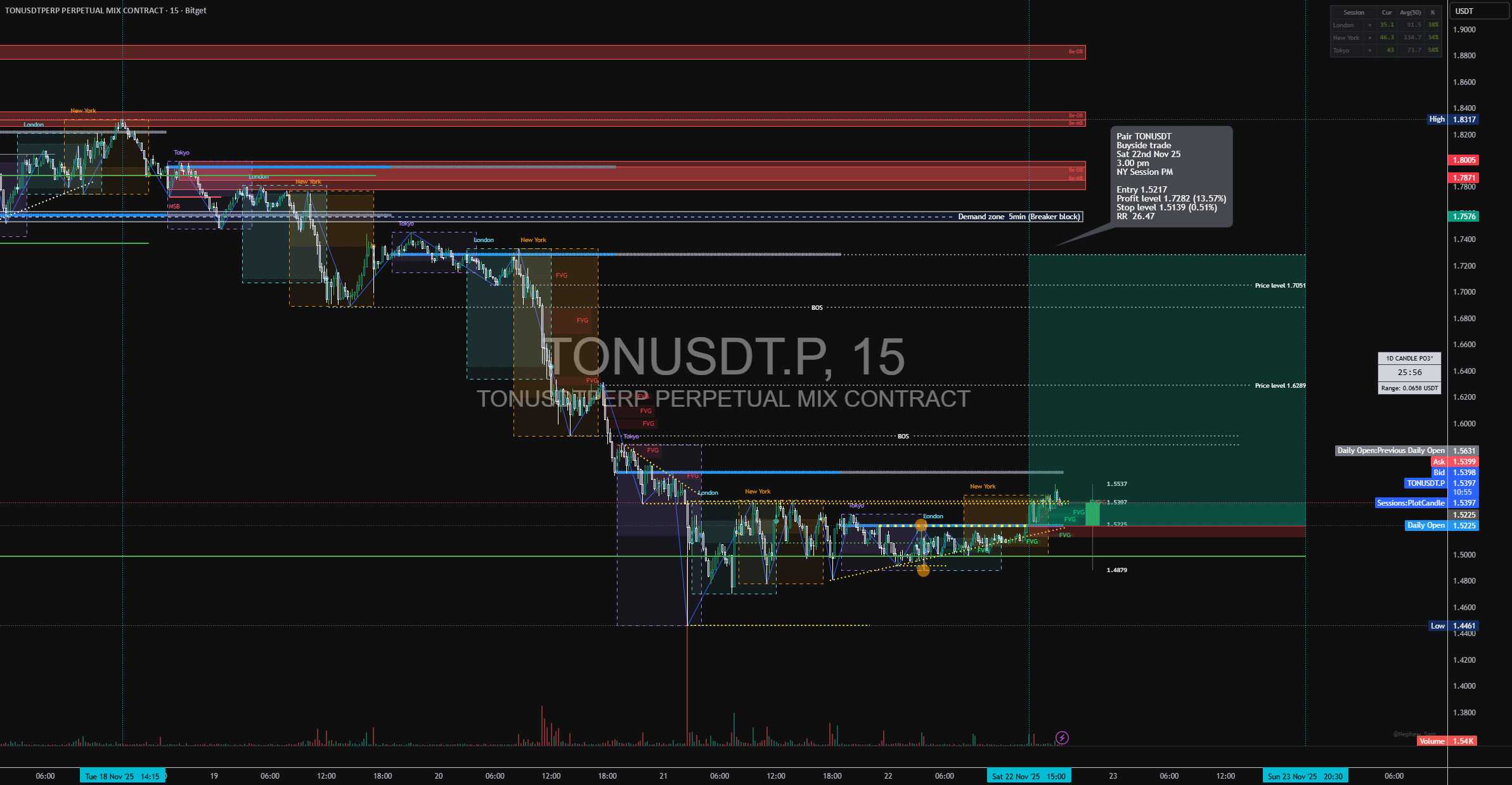ناحیه ورود بهینه (OTE) در پنجره نقدینگی سشن نیویورک عصر و مرز FVG قرار دارد. این نقطه در محدوده discount حرکت قیمتی و در بلوک breaker واقع شده است.