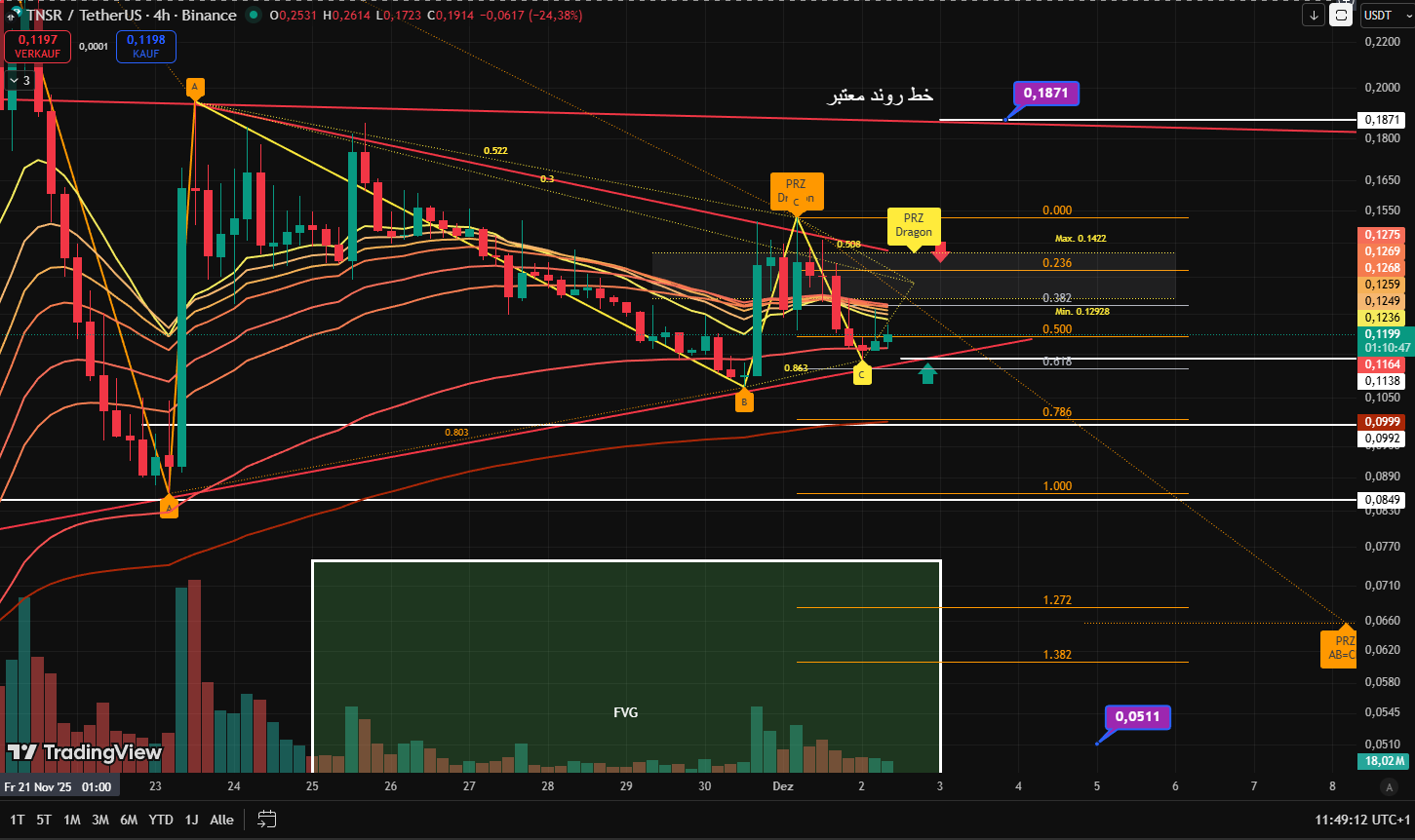 درود به شما.طبق این چارت 4 ساعته تنسور، الان داخل یک مثلث فشرده شده هست که هر لحظه ممکنه از یک سمت اون بشکنه.معمولا این مدل الگوها را از بالای مثلث میشکونند، اما روند مارکت و یا فاند بازار هم تاثیری روی خود ارز داره. داخل این عکس 2 تا خط روند قرمز دیده میشه که اون های همون مثلث هستن و زیر هر کدومش کلوز 4 ساعته و تثبیت بده، انتظار میره در همون جهت حرکت کنه. یک خط روند معتبر در بالا با رنگ سفید مشخص شده که چندین بار بهش ضربه زده و قصد داره مقاوت را بشکنه، با هر بار ضربه مقاوت ضعیف تر میشه و امکان شکستنش هم بالاتر. موینگ 100 در تایم 4 ساعته هم فعلا نقش حمایت لحظه ای قیمت را انجام میده. 2 تا الگوی هارمونیک به نام اژدها هم داریم که اولیش اتفاق افتاده و کامل شده، عدد ها با فیبوناچی کاملا مشخص هستن به رنگ نارنجی. الگوی بعدی به رنگ زرد هست و چنانچه کامل بشه اونم یک هارمونیگ هست که به حالت w معمولا در میاد و نشانه اصلاح عمیق تر را تایید میکنه. این ها فقط الگوهای 4 ساعته هستن و در تایم فریم بلندتر ممکنه تاثیر خاصی نزارن. احساس میش بازار روی خوشش را بزودی داره نشون میده در این ماه دسامبر. امیدوارم حال دلتون خوش و روحیتون عالی باشه