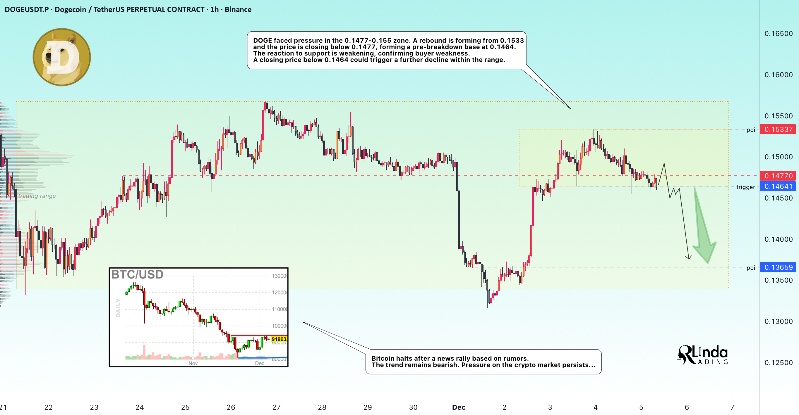 بسته شدن قیمت زیر ۰.۱۴۶۴ میتونه باعث ریزش بیشتر در این محدوده بشه.