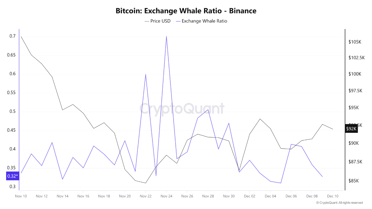 در حالی که بیتکوین از 85 هزار دلار به 92 هزار دلار برگشته، شاخص نسبت نهنگها همچنان کاهش یافته است. این یعنی بازیابی قیمت با فروش نهنگها روبرو نبوده و نهنگها مانع رونق بازار نشدهاند. آنها بیشتر به انباشت ادامه میدهند و منتظر واکنش بعد از تصمیم فدرال رزرو هستند، با این احتمال که بیشتر دارندگان بزرگ، موقعیت اسپات خود را حفظ کردهاند.