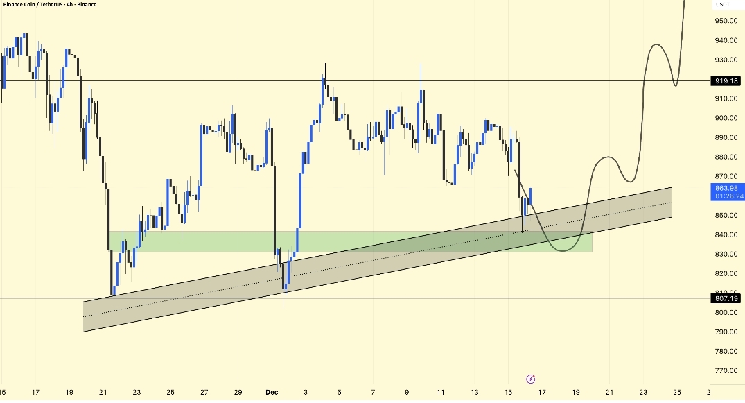 بایننسکوین در تایم فریم 4 ساعته، به حمایت کانال صعودی در حدود ۸۴۰-۸۵۰ برگشت که یک منطقه تقاضای کلیدی براش به حساب میآد و خوشبختانه مورد حمایت قرار گرفت.