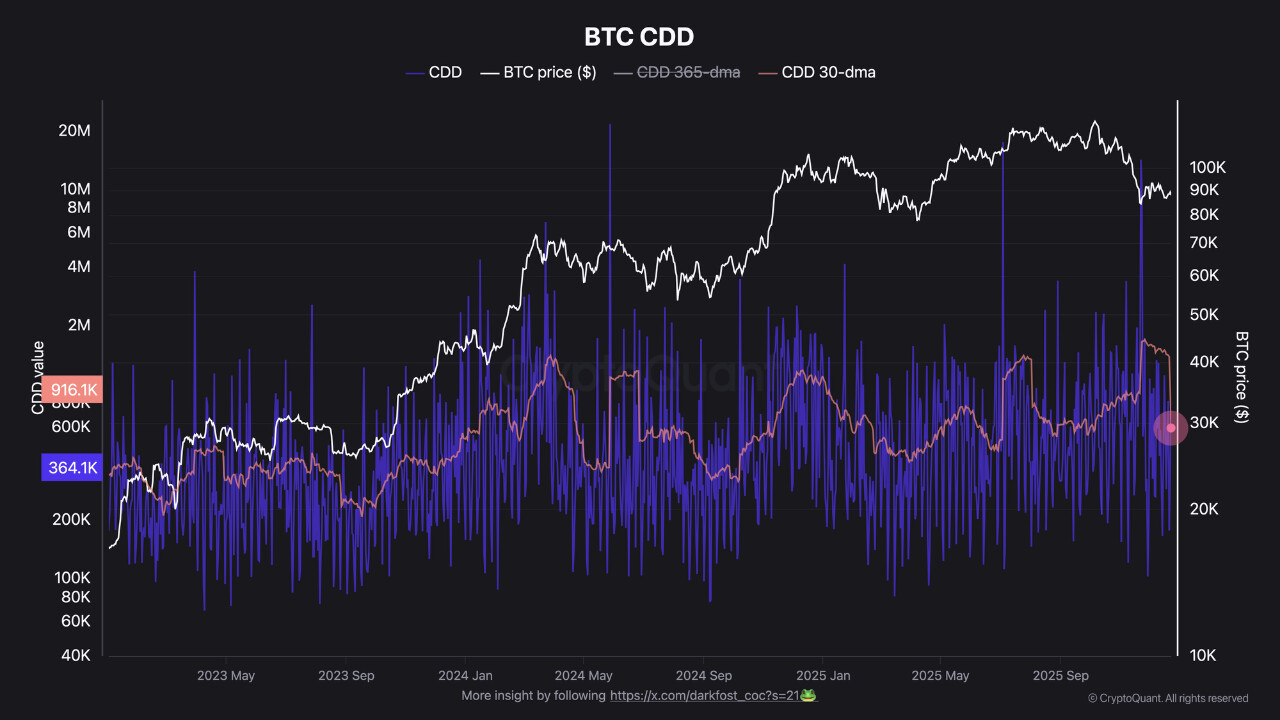برای کسایی که با این اندیکاتور آشنایی کمتری دارن، CDD ساده بگم تعداد روزهای نگهداری یک UTXO رو قبل از خرج شدنش اندازهگیری میکنه. وقتی بیتکوینهایی که مدت طولانی هولد شدن شروع به حرکت میکنن، اغلب نشونه آمادگی برای فروشه.