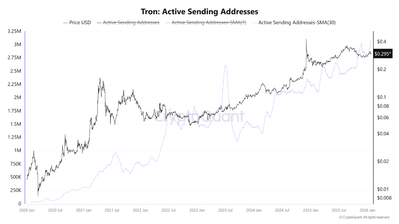 میانگین متحرک ساده 30 روزه آدرسهای فعال ارسالکننده در شبکه ترون به سقف تاریخی جدید 3.1 میلیون رسیده. این افزایش چشمگیر نشوندهنده رشد پایدار در تقاضا و کاربرد شبکه است، مستقل از نوسانات کوتاهمدت بازار.
