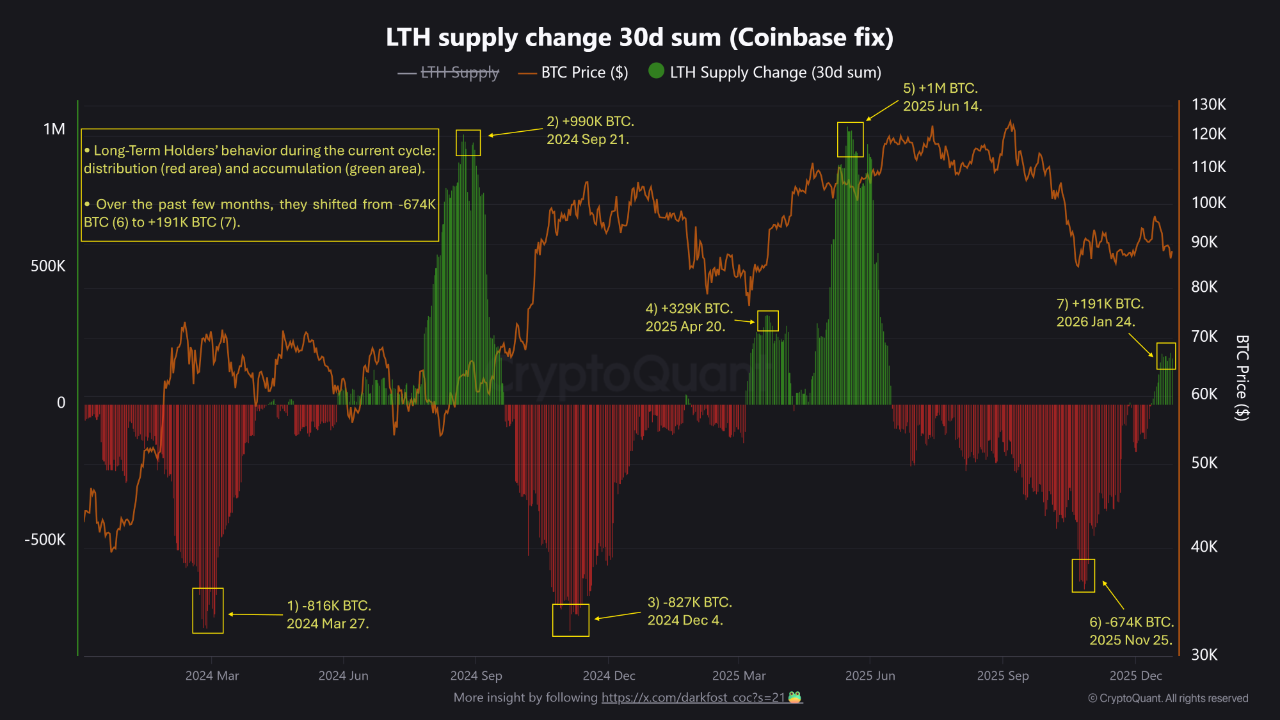 این دادهها بر اساس اندیکاتور LTH Supply Change 30d sum (توسط Darkfost، نویسنده تایید شده CryptoQuant) استخراج شده.