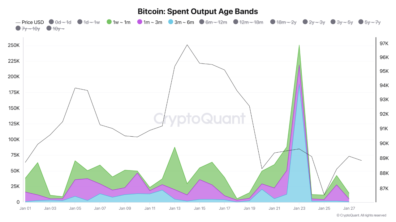 در تاریخ ۲۳ ژانویه، شاهد افزایش ناگهانی در تعداد UTXOهایی بودیم که توسط هولدرهای کوتاهمدت (STH) خرج شدند.