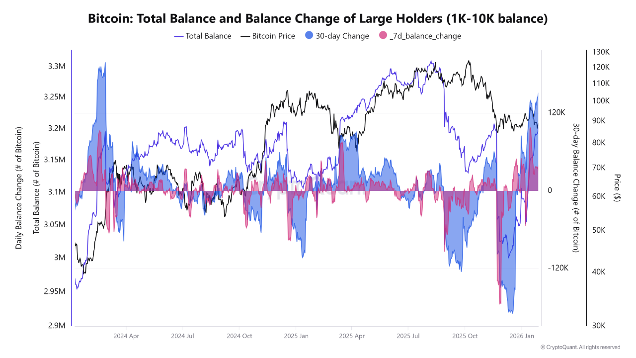 دادههای مربوط به تغییرات موجودی نهنگهای بیتکوین (آدرسهایی که بین ۱,۰۰۰ تا ۱۰,۰۰۰ BTC نگهداری میکنند) نشاندهنده یک تغییر ساختاری واضح در رفتار سرمایهگذاران بزرگ هستند. آخرین دادهها حاکی از شتاب قابل توجه در روند تجمع نسبت به دورههای قبلی است و به بالاترین سطح از ابتدای سال ۲۰۲۴ رسیده. کل دارایی نهنگها به حدود ۳.۲۰۴ میلیون BTC افزایش یافته که بازگشت مجدد علاقه بلندمدت این گروه تاثیرگذار را تأیید میکند.
