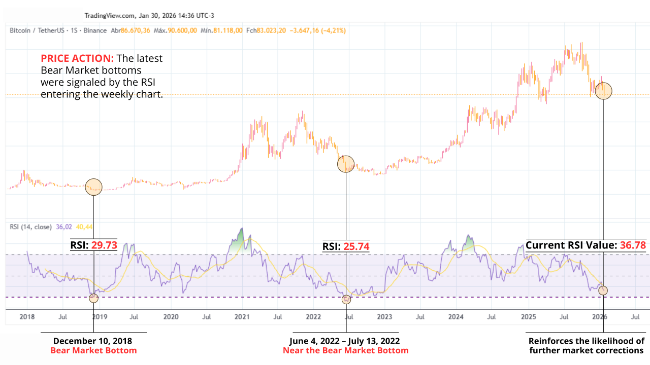 RSI هفتگی که به سطح 30 واحد نزدیک شده، یک سیگنال تاریخی رو فعال کرده. در دو بازار نزولی گذشته، کف بازار فقط زمانی تایید شد که این اندیکاتور زیر این سد رفت و به 29.73 (12/10/2018) و 25.74 (06/04/2022 - 07/13/2022) رسید. در حال حاضر با 36.78 واحد، بازار به آستانه یک لحظه تعیینکننده نزدیک شده. این سناریوی تکنیکال، همراه با فشار اقتصاد کلان، بازار رو در لبه یک تست حیاتی قرار داده.