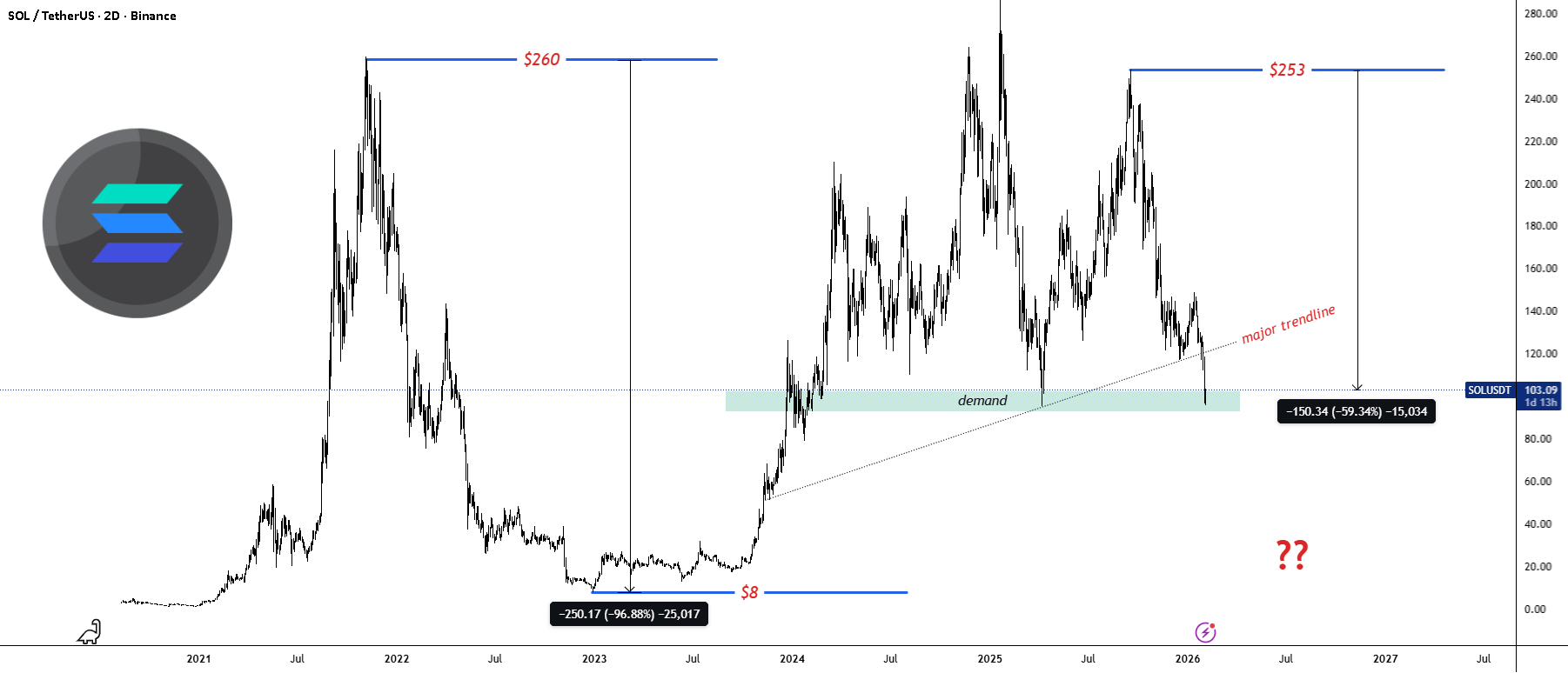 سولانا خط روند اصلی خودش رو از دست داده و الان وارد یک ناحیه با احتمال ریزش بالا شدیم.