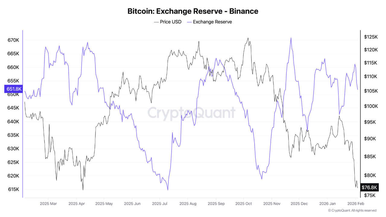 ذخایر بایننس علیرغم فشار بازار پایدار مونده. بایننس در حال حاضر حدود 659 هزار BTC نگهداری میکنه که عملاً بدون تغییر نسبت به 657 هزار BTC در پایان سال 2025 هست و 7% بالاتر از کف سالانهاش در 10 ژوئیه 2025 قرار داره. این موضوع نشون میده که هیچ فرسایش قابل توجهی در ذخایر در طول ریزش فعلی بیتکوین رخ نداده.