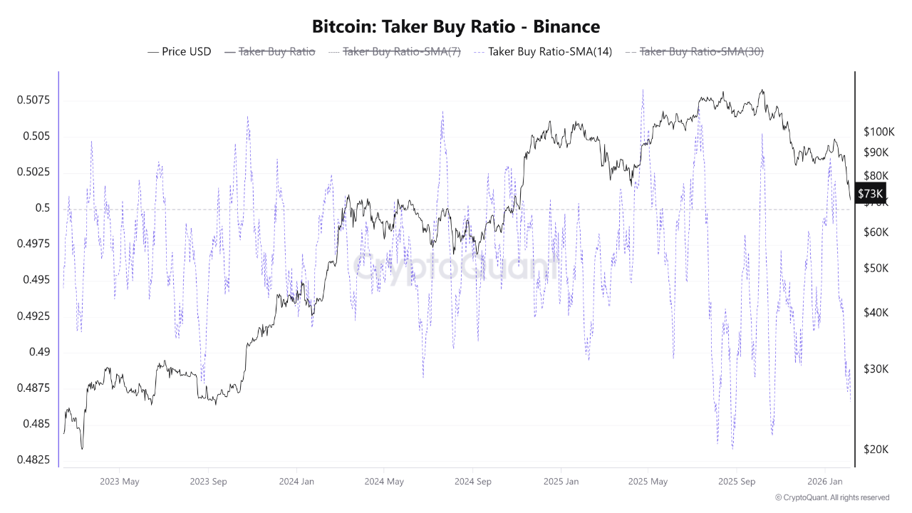 درحالیکه قیمت روی حمایت نشسته، دادههای مشتقات نشوندهنده فشار فروش شدیده. نسبت خرید تیکر بیتکوین (میانگین متحرک 14 روزه) تو بایننس به 0.486 رسیده که پایینترین سطح از اکتبر ماه گذشته تا الانه.